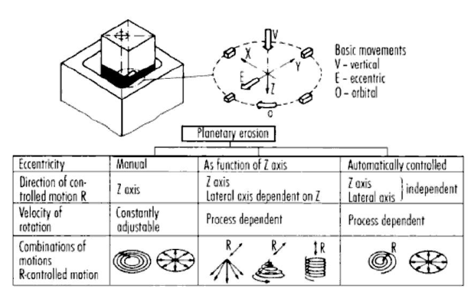 In plain vertical eroding,the eroded configuration is already dimensionally determined by the shape and dimensions of the electrode- Machining of undercuts is not feasible. The introduction of planetary electric-discharge machining has now extended the possibilities of the erosion technique. It is a machining technique featuring a relative motion between workpiece and electrode that is achieved by a combination of three movements, vertical, eccentric and orbital. The planetary electric-discharge machining is also known as the three-dimensional or multi-space technique. The technological advantages of planetary electric-discharge machining are presented. This technique now allows undercuts to be formed in a cavity. A further, major advantage is that, through compensation of the undersized electrode, it is possible to completely machine a mold with just one electrode.
