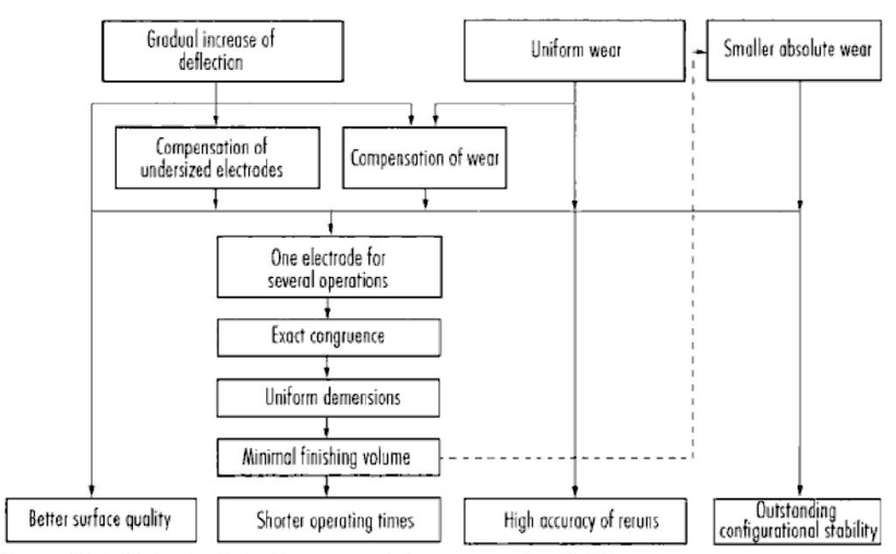 With each consecutive impulse, a low volume of material of the workpiece and the electrode is heated up to the melting or evaporation temperature and blasted from the working area by electrical and mechanical forces. Through judicious selection of the process parameters, far greater removal can be made to occur at the workpiece than at the tool,allowing the process to be economically viable. The relative abrasion, i.e. removal at the tool in relation to removal at the workpiece, can be reduced to values below 0.1% .